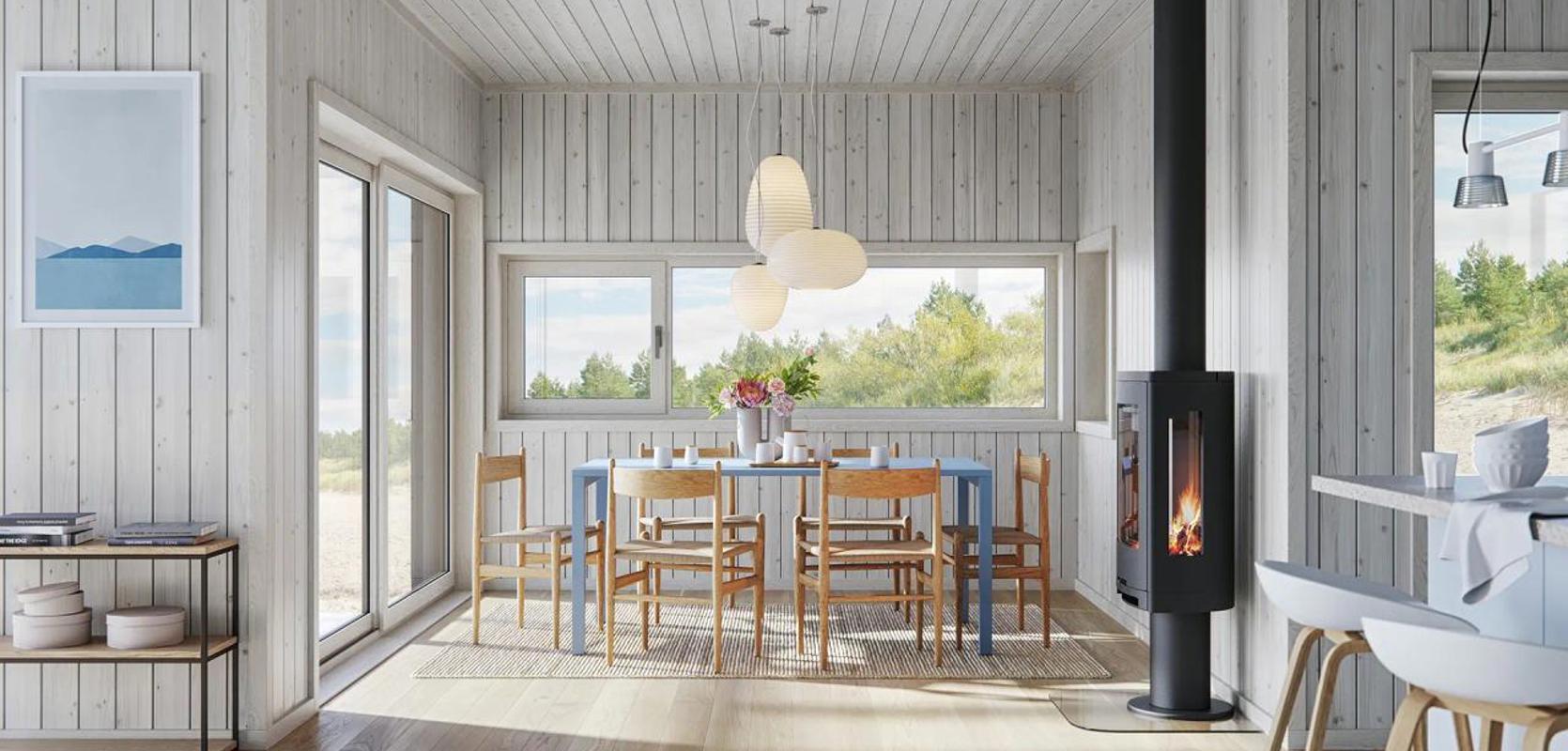 Funkishytta er utstyrt med store vinduer som gir rikelig med naturlig lys, og når hytta er plassert på en vakker tomt, fungerer vinduene som et levende maleri.
